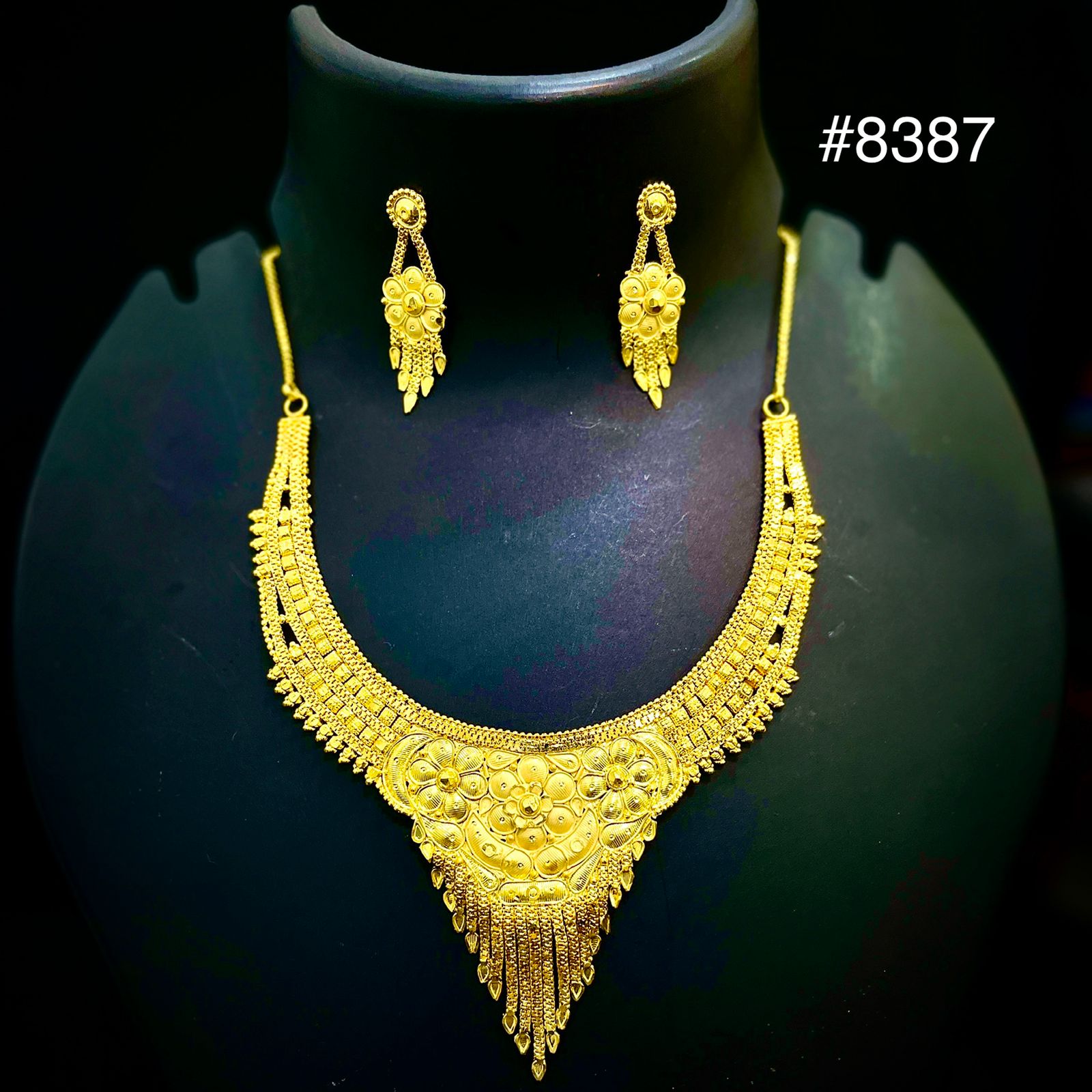 This elegant Gold Plated necklace and earrings set features intricate floral motifs and handcrafted detailing that exude timeless beauty. Perfect for weddings, festive occasions, and parties, it blends traditional Indian artistry with modern elegance. Lightweight, durable, and tarnish-resistant, it adds a luxurious touch to any outfit.