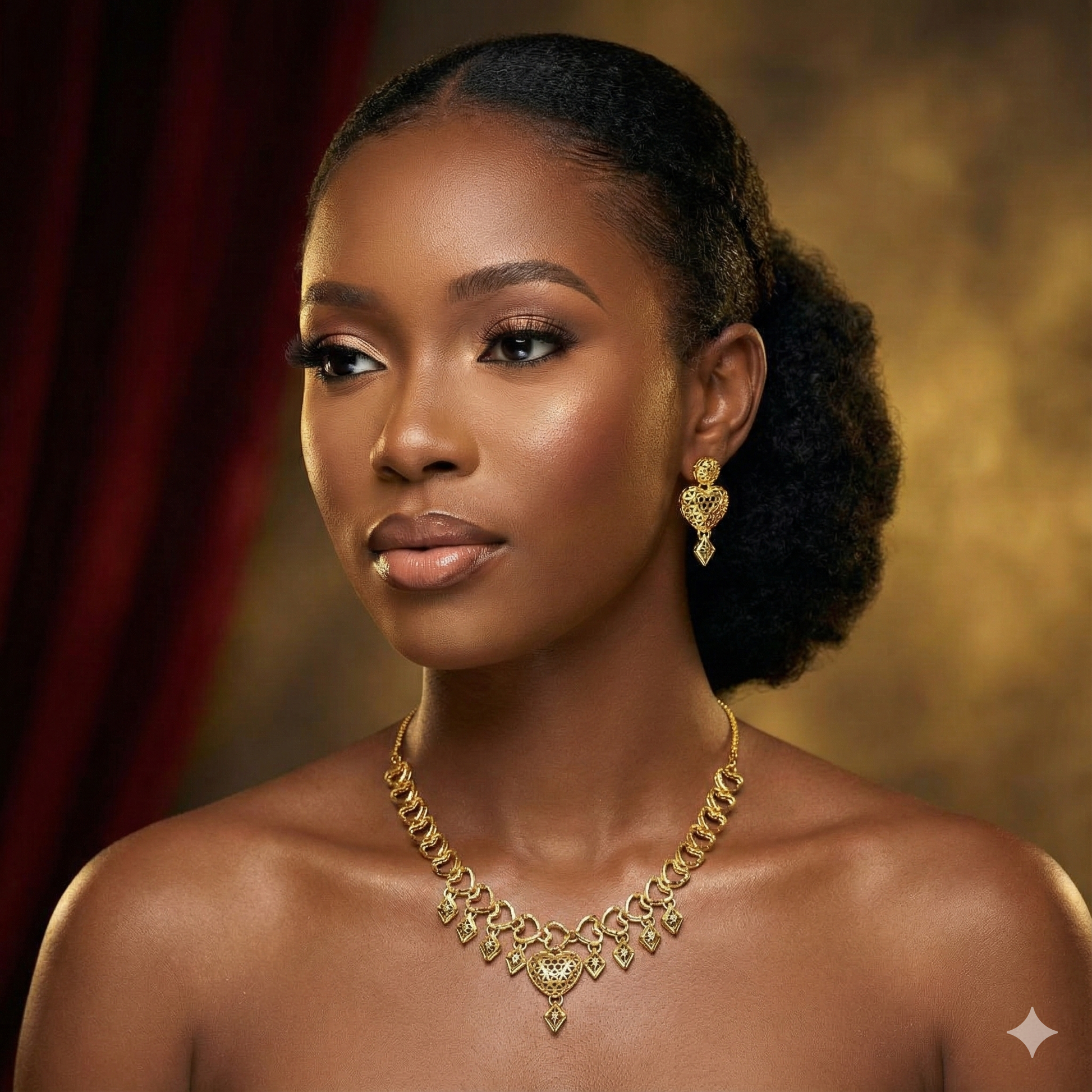 ✨ Elevate your style with this gold-plated heart-motif necklace and earrings set, crafted with intricate filigree detailing. The dangling diamond-shaped charms add elegant movement, making it perfect for festive, bridal, and party wear. Lightweight, skin-friendly, and designed to complement both traditional and Indo-western outfits. A timeless piece from Poojamani Jewellers that adds effortless charm to every look.