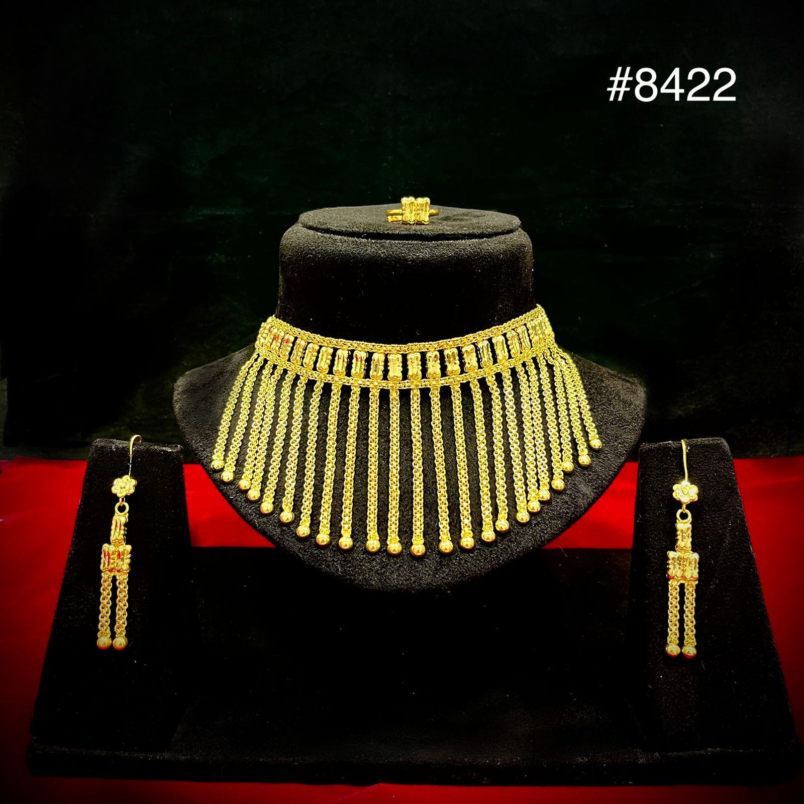 Design #8422 is a premium gold-plated fringe choker necklace set paired with matching long earrings, crafted for a regal and statement-making look. The cascading chain design with bead-drop detailing adds movement and elegance, perfect for bridal, partywear, and festive outfits. This designer set blends modern glamour with traditional craftsmanship, making it ideal for sarees, lehengas, and Indo-western attire.