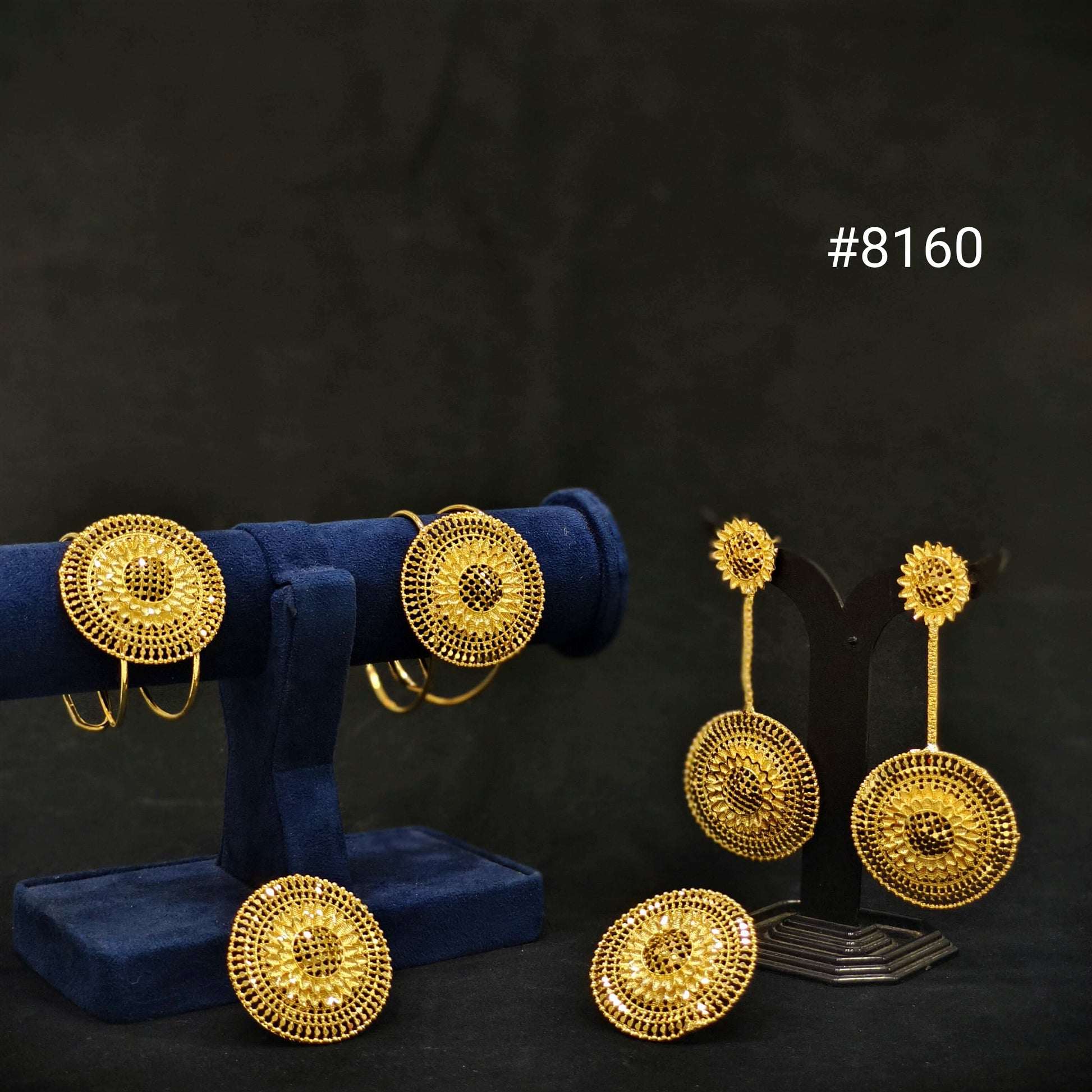 Elevate your style with our Radiant Gold Collection – Design #8158, a stunning ensemble featuring a beautifully crafted bracelet set, elegant dangling earrings, and intricately detailed finger rings. Each piece showcases a captivating circular filigree pattern that reflects traditional artistry with a modern twist.