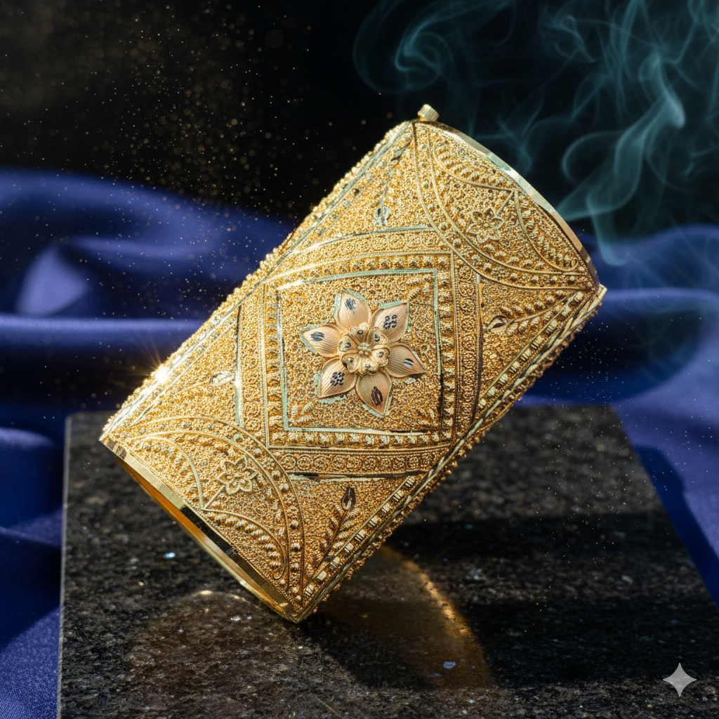 Elevate your style with this exquisite gold-plated designer bracelet (#8389), featuring intricate filigree patterns and a stunning floral centerpiece. Handcrafted to perfection, it blends traditional artistry with modern elegance. Ideal for weddings, festive occasions, and ethnic wear, this luxurious bracelet adds a royal touch to every outfit.