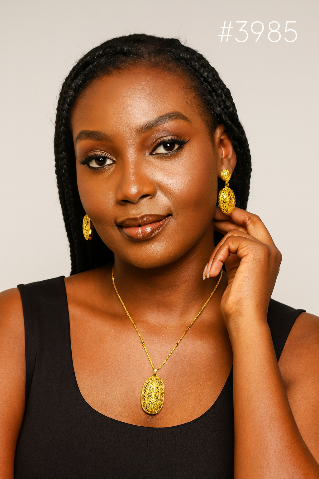 View this captivating combination of lovely earrings and a pendant made of gold plating. What a stunning pendant set this is!