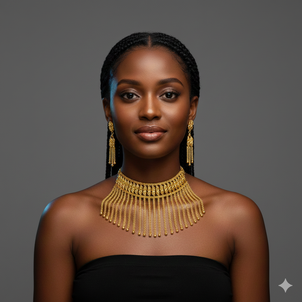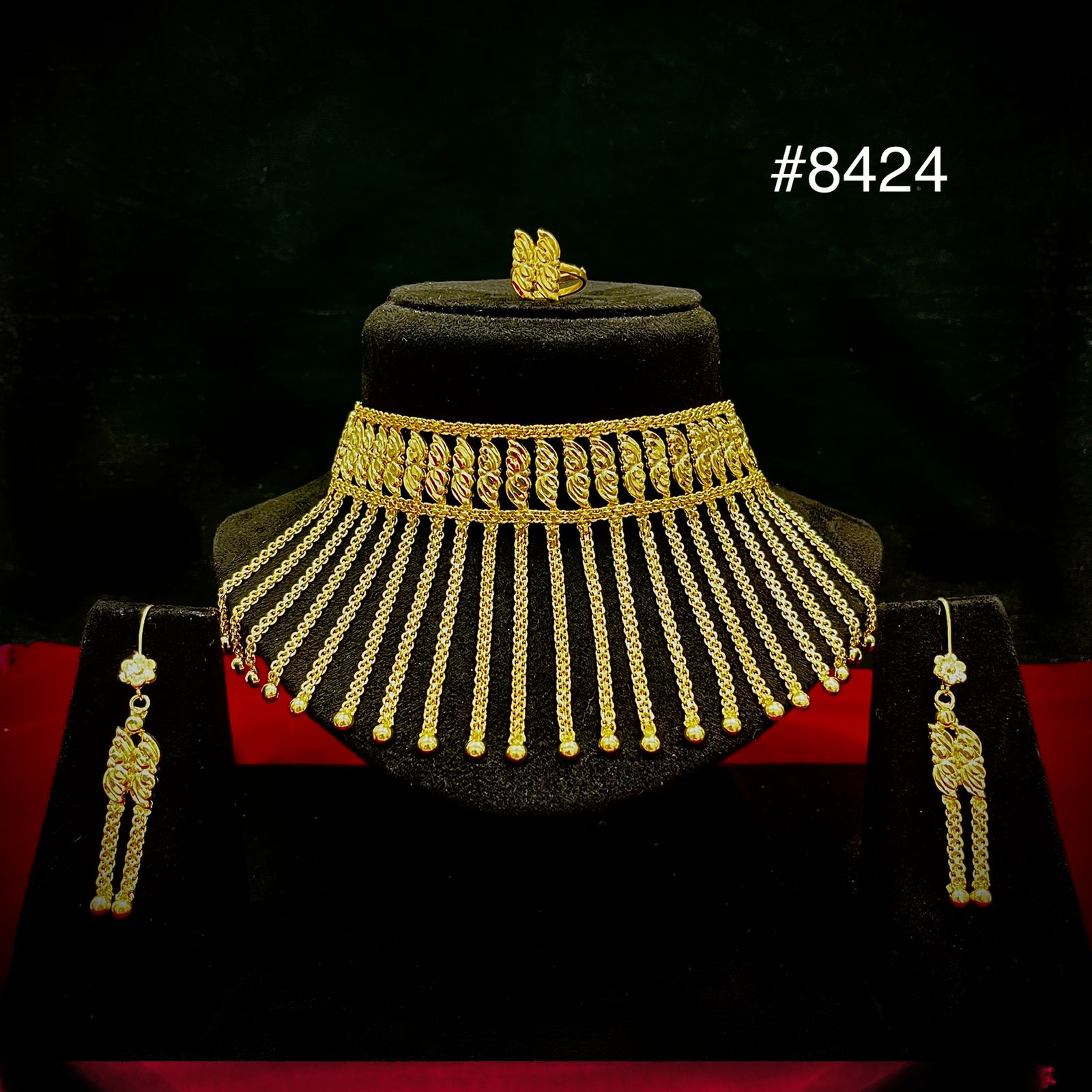 Design #8424 is a luxurious gold-plated spiral motif choker necklace set featuring elegant long chain fringes for a rich, flowing look. Paired with matching dangle earrings, this set blends traditional craftsmanship with modern glamour, making it perfect for bridal, festive, and partywear styling. Its intricate spiral detailing and cascading chains create a bold statement that complements sarees, lehengas, gowns, and Indo-western outfits beautifully.
