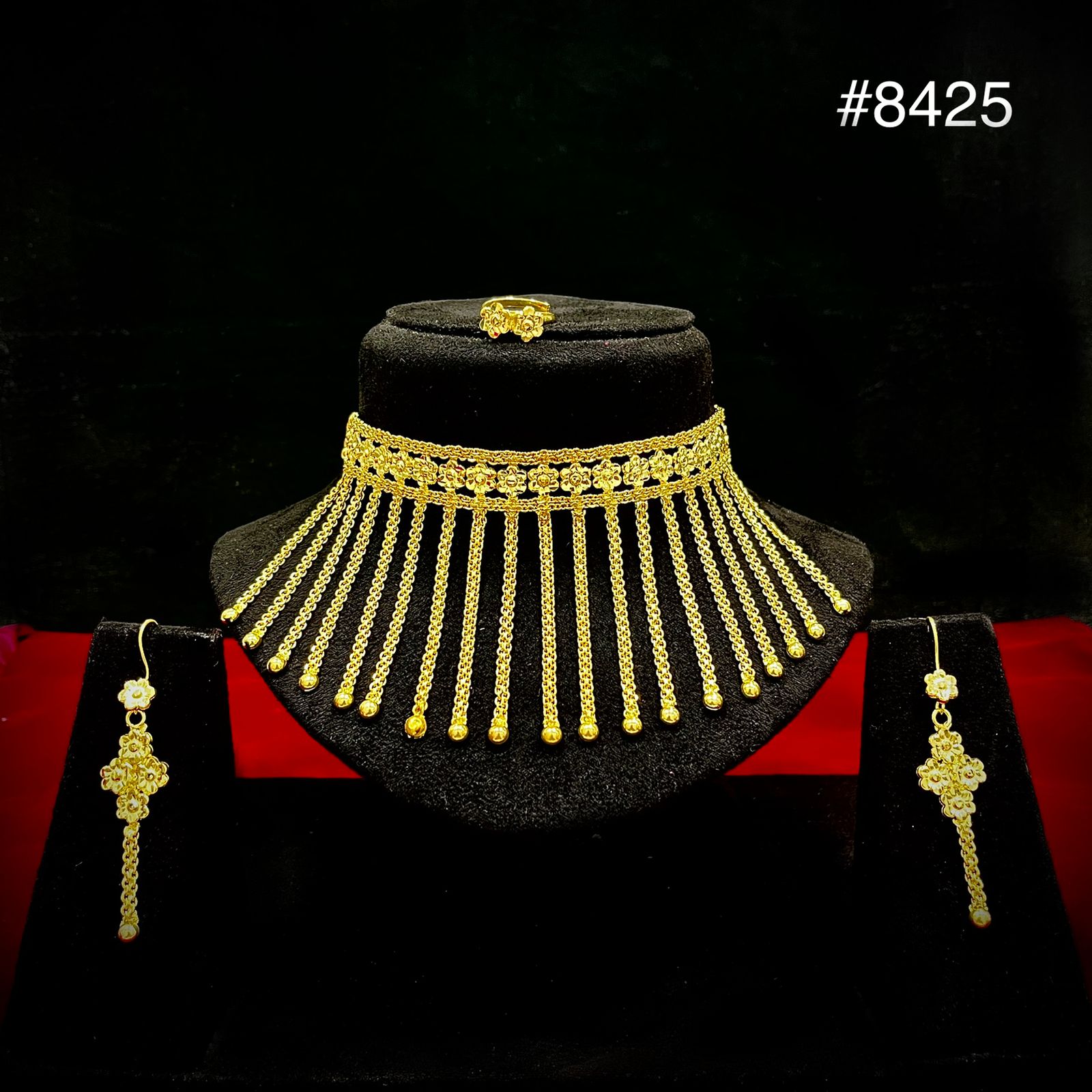 Design #8425 is a stunning gold-plated floral motif choker necklace set featuring long cascading chain fringes for a bold, elegant look. Paired with matching floral dangle earrings, this set blends delicate craftsmanship with a grand, statement finish. Perfect for bridal, festive, and partywear styling, it enhances sarees, lehengas, and designer gowns with its radiant and luxurious design.
